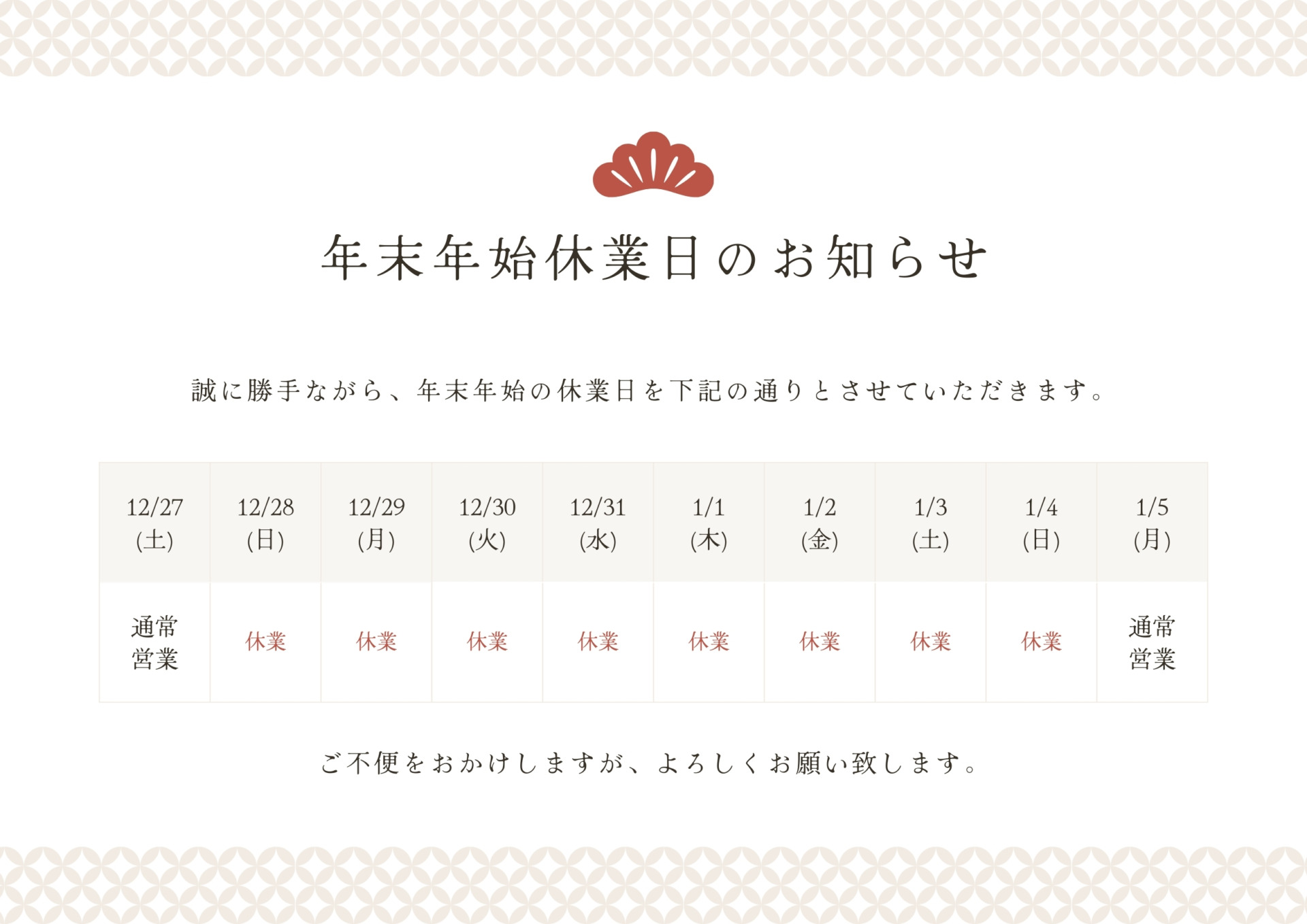 2025年12月28日~2026年1月4日までの期間を年末年始休暇とさせていただきます。
